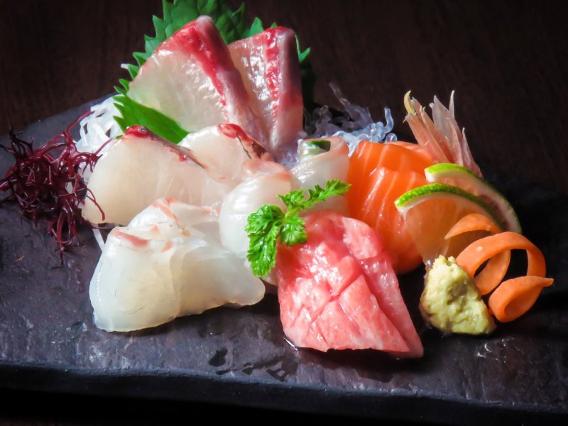 (squid, tuna, flounder, striped jack, otoro, sea bream, hirasu(yellowtail), kuruma shrimp, abalone, sea urchin)