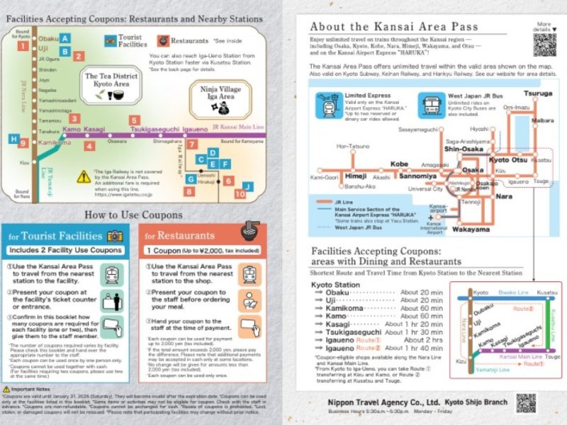 This product includes admission to two tourist facilities, ¥2,000 worth of meal vouchers, and the Kansai Area Pass for unlimited JR travel in the Kansai region for one day.