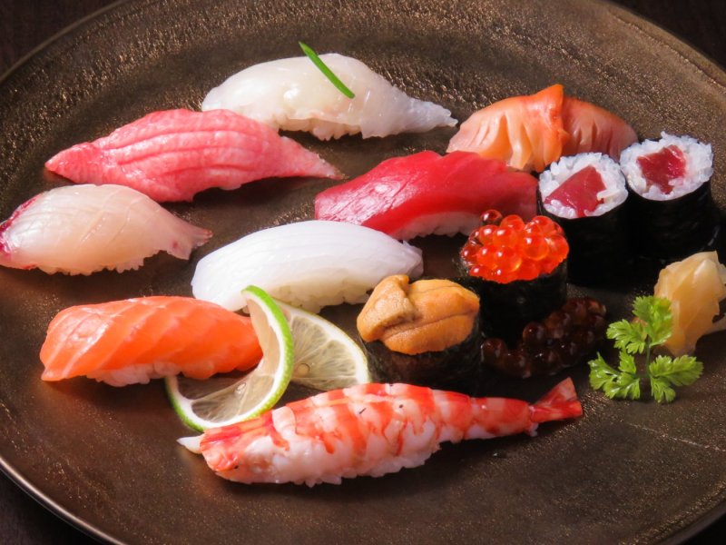 (squid, tuna, flounder, striped jack, otoro, sea bream, hirasu(yellowtail), kuruma shrimp, abalone, sea urchin)